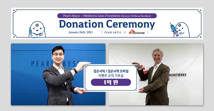 ... '나눔의 증표' 구매가 총 1조가 달성되어 약속대로 펄어비스가 1억원을 기부했다. 후원금은 작년에 이어 국경없는의사회에 전달해 전 세계 무력분쟁, 전염병 및 자연재해 지역과 의료 사각지대에서 고통받고 있는 환자를 위한 의료 지원 활동에 사용될 예정이다.