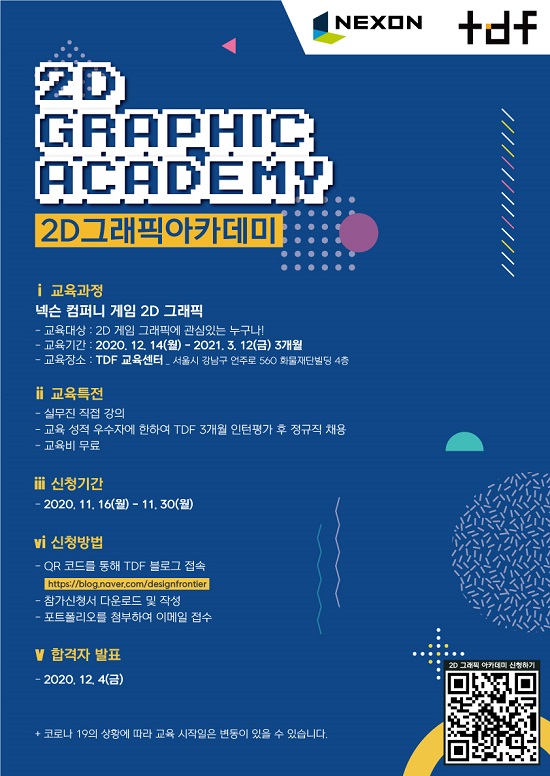 ... 게임 2D 그래픽 분야에 관심이 있는 사람이라면 학력 및 경력과 무관하게 지원할 수 있으며, 티디에프 블로그를 통해 참가신청서를 다운로드 후 개인 포트폴리오와 함께 접수하면 된다. 티디에프 성기홍 아트센터장은 “실무 위주의 수준 높은 교육 과정으로, 상반기