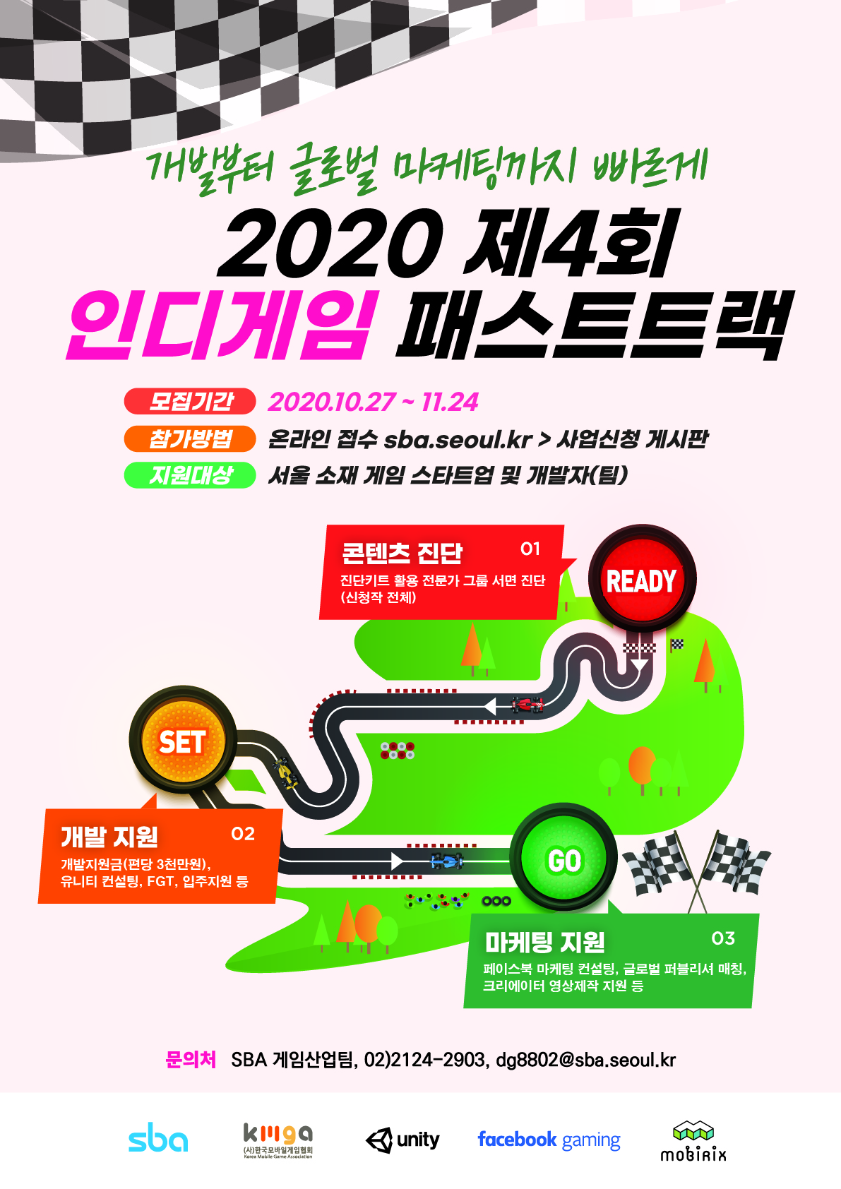 ... ‘인디게임패스트트랙’은게임개발부터글로벌마케팅까지빠르게지원하는종합성장지원체계로4회차를맞이하였다. 사업지원의내실을더욱강화하고사업체계를보완하여‘콘텐츠진단(READY)-개발지원(SET)-마케팅지원(GO)’3단계로구성하였으며,실질적인지원프로