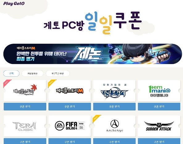 ... 지금까지 총 63종 게임에서 ‘일일쿠폰’ 서비스를 통해 게임 쿠폰을 발행했고, 하루 최다 다운로드 기록은 4만 2천 건이다. ‘일일쿠폰’에서 가장 많은 인기를 누린 게임은 ‘메이플스토리’와 ‘FIF