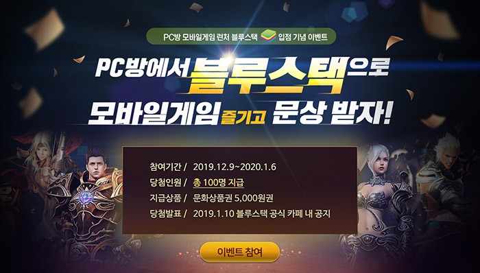 ... ‘PC방 모바일게임 런처 내 블루스택 입점기념 이벤트’로 PC방 매장을 방문한 이용자들은 바탕화면에 설치된 ‘모바일게임 런처’ 내 블루스택 아이콘을 클릭하여 블루스택으로 모바일게임을 플레이하고 인증사진을 남기면 추첨을 통해 총 50