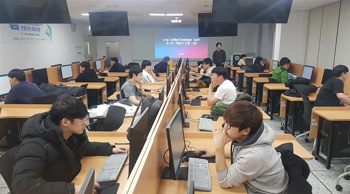 ... 유니티 글로벌 인증 자격시험은 전 세계 최초의 게임 개발 전문 인증 자격시험으로, 유니티를 사용하는 프로그래머와 아티스트가 본인의 지식과 실력을 객관적으로 표현할 수 있도록 한 시험이다. 이 날, 총 15명의 교육수료생이 응시한 결과 13명의 합격자를 배출해내