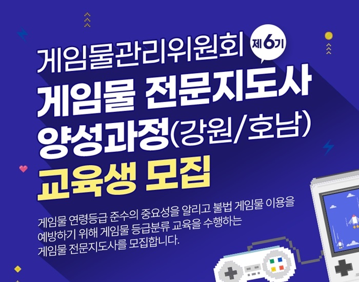 ... 특히 이번 ‘게임물 전문지도사’는 지역별 교육의 편차를 줄이고자 호남‧강원 지역을 중심으로 양성할 예정이다. ‘게임물 전문지도사’는 서울과 부산지역의 경력단절여성 모니터링단을 중심으로 2019년에 처음 운영되었으며, 2023년까
