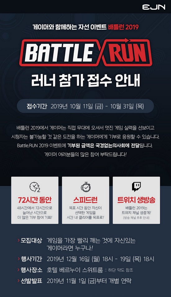 ... 스피드런은 최단시간내에 게임을 클리어하는 방식으로 얼마나 빠르게 게임을 클리어 하느냐가 관건이 된다. 이번 ‘배틀런 2019’는 10월 11일부터 10월 31일까지 게이머 및 스트리머의 접수를 시작으로 선발된 인원이 12월 16일부터 72시간 동안 불