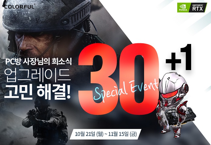 ... 9월과 10월은 PC방 수요가 적은 비수기임을 감안했을 때 놀라운 성과였고, 20+1 행사에 참여한 PC방 사업주의 반응 역시 무척 뜨거웠다. 이에 웨이코스는 10월 21일부터 11월 15일까지 한정 수량으로 ‘컬러풀 RTX SUPER 30+1’ 프로