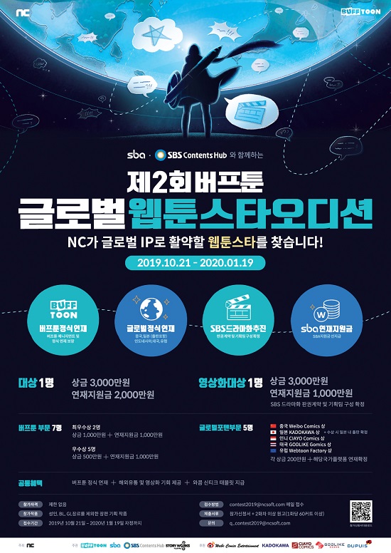 ... 제2회 버프툰 글로벌 웹툰스타 오디션은 엔씨(NC)가 주최하고 엔씨(NC), SBA, SBS콘텐츠허브가 공동 주관하는 웹툰 공모전으로, 작년 12월 열린 제1회 공모전에 이은 2번째 개최다. 엔씨(NC)는 이번 공모전 주최사로서 당선작의 버프툰 정식 연재, 매니지먼트 등을