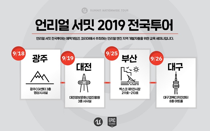 ... 올해 전국 투어는 광주와 대전, 부산, 대구 등 총 4개의 도시에서 개최된다. 18일 광주를 시작으로 19일에 대전, 25일 부산을 거쳐 26일 대구에서 마무리되는 일정이다. <언리얼 서밋 전국 투어>의 특성은 도시마다 똑같은 내용의 강연을 진행하는 것이
