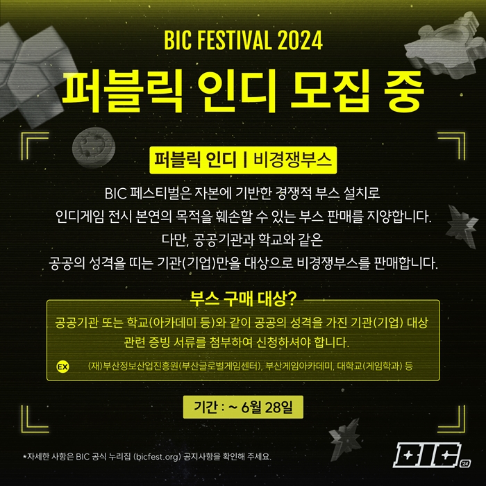 ... 전년도 퍼블릭 인디 참가 기업 관계자는 "퍼블릭 인디 참가가 기관과 지원 사업 개발작을 대외적으로 알릴 수 있는 좋은 기회가 되어주었다"며, "앞으로도 BIC 참가를 통해 성과를 널리 알리고, 기관의 위상을 높여 나갈 계획이다. "고 참가