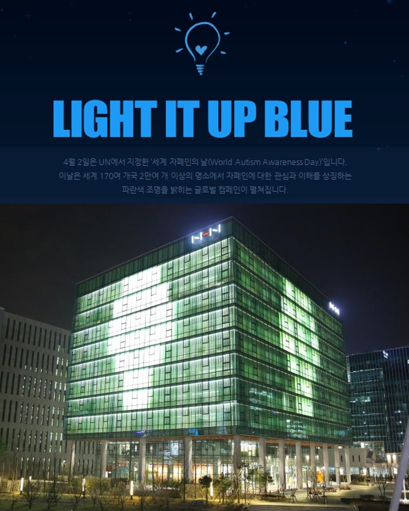 ... 올 해는4월2일 저녁7시부터8시까지 한 시간 동안 플레이뮤지엄 사옥에서 건물 외벽에 설치된 녹색의 루버를 활용해 캠페인의 상징인 전구 모양을 연출할 예정이다. NHN은 경기도 판교 테크노밸리의 랜드마크로서, 2014년 부터 이 캠페인에 동참하고 있다.