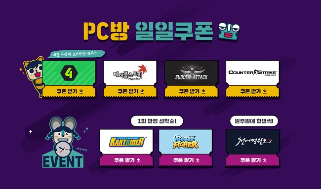 ... 기존의 ‘EA SPORTS™ FIFA Online 4’와 ‘메이플스토리’를 포함해 PC방 점유율 10위 이내 게임 중 4종의 쿠폰을 제공하며 혜택 범위를 강화했다. 일일쿠폰 서비스 이용이 가능한 매장은 '게토 PC방 찾기 페이지(https://i. nx