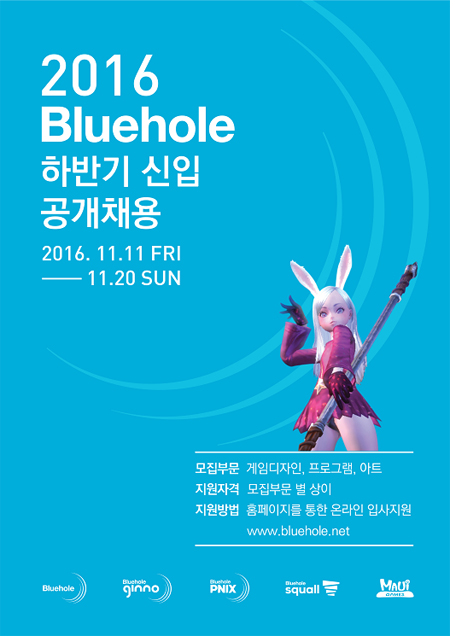 ... 전형 절차는 서류 심사, 역량 및 인성 인터뷰 순서로 진행되며, 최종 합격자는 12월 말에 개별 통보될 예정이다. 블루홀은 블록버스터급 게임을 통해 동서양에서 모두 인정 받는 게임 제작 명가로서의 입지를 다지기 위해 PC온라인뿐만 아니라 모바일, VR, 콘솔 등 다양한 플랫폼