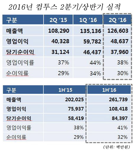 ... 이는 2015년 상반기 대비 매출 30%, 영업이익 43%, 당기순이익 44% 상승이다. 이와 같은 매출은 전 세계적으로 흥행에 성공을 거둔 모바일게임 '서머너즈워'를 비롯해 '낚시의신' '골프스타' 등이 견인했다. 특히 올해 상반기 매출 가운데 해외 매출은 2248억원에 달