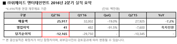 ... 회사 측은 "2분기 온라인과 모바일 게임 매출이 전분기 대비 감소했고 카카오 주식 평가로 인한 금융손실의 영향으로 당기순손실이 발생했다"고 설명했다. 하반기 위메이드는 지난달 북미 유럽 시장에서 성공적으로 정식 서비스를 시작한 PC 온라인 게임 '이카루스'를 시작으로
