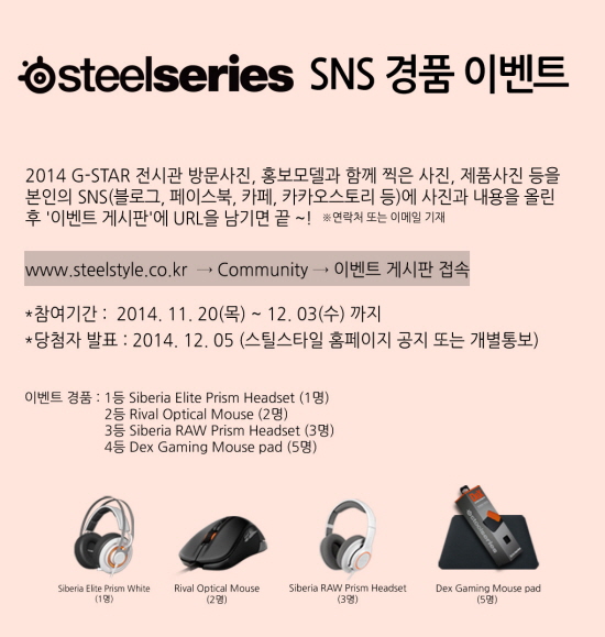 ... 전시장에 있는 홍보 모델과 인증샷을 찍은 후 SNS, 카페, 블로그 등에 올리면 고급 무릎 담요와 스틸시리즈 퀵 미니 마우스 패드 중 하나를 선물로 받을 수 있다. 해당 이벤트는 오전 11시부터 12시30분, 오후 3시부터 4시30분까지 1일 2회에 걸쳐 진행된다. 박재천 스틸