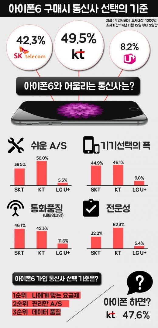 ...두잇서베이가 오늘 공개한 설문통계에 따르면, 아이폰과 통신사에 대한 소비자 인식은 ‘아이폰 6와 가장 잘 어울리는 통신사’(KT 49. 5%, SKT 42. 3%, LGU+ 8