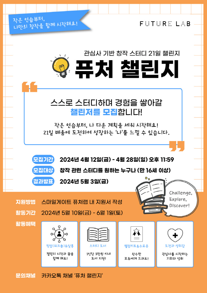 ... 퓨처 챌린지는 자신의 관심사에 기반해 학습 계획을 세워 21일 동안 창작 활동을 해볼 수 있는 프로그램이다. 참가자들은 챌린지 기간 동안 본인만의 관심사를 탐구하고, 학습 습관을 만들어 창작물을 만드는 경험을 할 수 있다. 게임, 영상, 글쓰기, 미술, 프로그래밍 등 다
