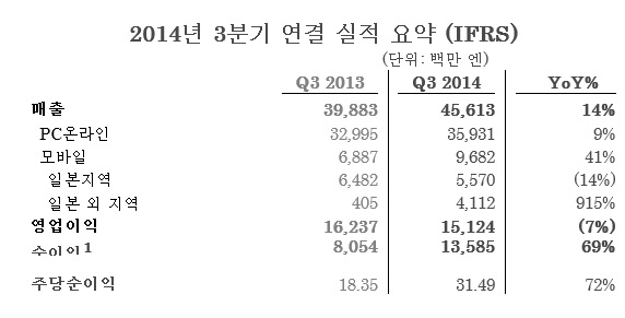 ... 도쿄증권거래소 1부)은 13일 자사의 2014년 3분기 연결 실적을 발표했다. 3분기 매출은 전년 동기 대비 14% 증가한 456억 엔(약 4,494억 원), 영업 이익은 전년 동기 대비 7% 감소한 151억 엔(약 1,490억 원), 순이익은 전년 동기 대비 69% 증가한 1
