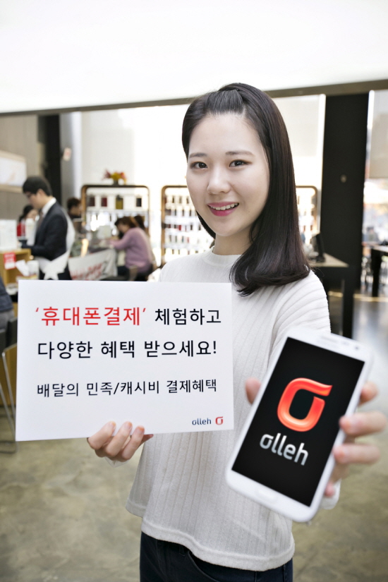 ...KT는 휴대폰 결제 서비스를 알리기 위해 다양한 이벤트를 마련했다. 우선 배달앱 ‘배달의 민족’에서 8,000원 이상 휴대폰 결제 서비스로 즉시 결제하면 1,000원의 할인 혜택을 제공한다. 또 휴대폰의 NFC를 활용, 교통 서비스 결제를 지원하는 ‘모바일 캐시비’ 앱에서 휴대폰