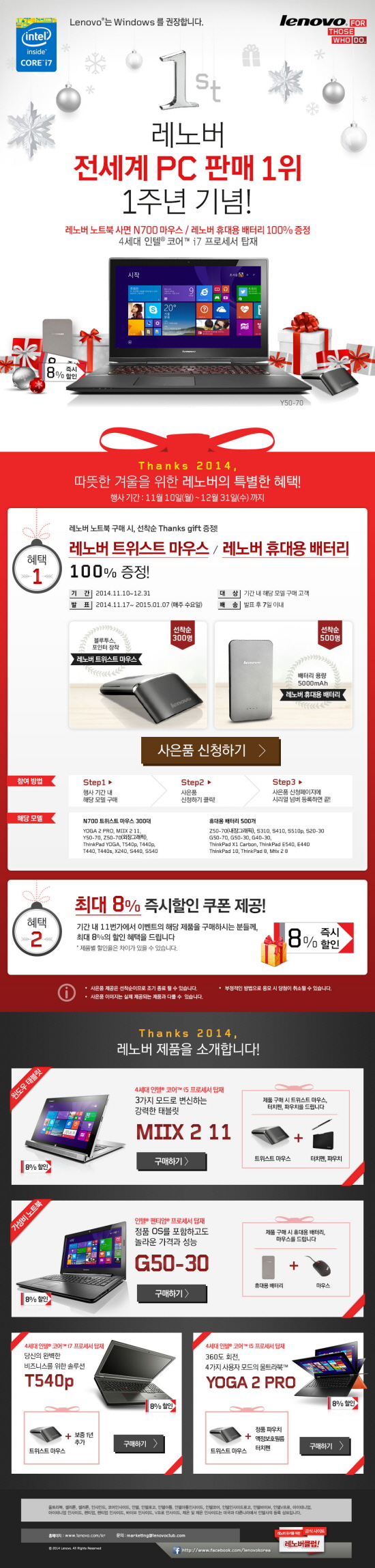 ...특히 게이밍 노트북 ‘Y50-70’와 엔터테인먼트 노트북 ‘Z50-70’을 구매하는 고객에게는 각각 ‘정품ODD-트위스트 마우스’, ‘128GB SSD’를 추가로 증정한다. 이외에도 제품별로 정품가방 및 파우치, 터치펜, 1년 추가 무상 보증기간 제공, MS오피스 365 1년 사용