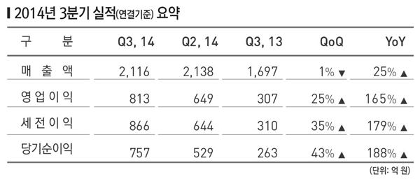 ... 지역별 분기 매출은 한국 1,385억 원, 북미유럽 386억 원, 일본 101억 원, 대만 21억 원, 로열티 223억 원이다. 제품별 매출은 리니지 685억 원, 리니지2 148억 원, 아이온 329억 원, 블레이드 & 소울 198억 원, 길드워2 197억 원,