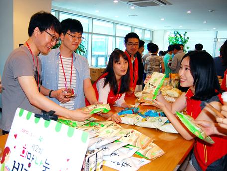 ... 컴투스 임직원들은 바자회를 위해 2주간 개인 물품을 기증했고 바자회 당일에는 의류, 가방 등 각종 생활용품 등 다양하게 마련된 물품이 성황리에 판매되어 풍성한 나눔의 시간을 가졌다. 이렇게 마련된 기증품과 바자회를 통해 재판매 된 수익금은 아름다운 가게에 전달되어 소외계층 지