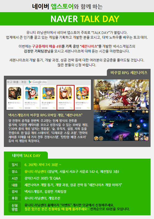 ... 세븐나이츠는 양 진영이 한번씩 공격을 주고 받는 턴제형 RPG이며 230여종의 개성 넘치는 영웅들을 수집 및 육성하는 재미가 강점인 게임이다. 또 다양한 컨셉의 7개 스테이지와 다채로운 스킬조합 등이 특징으로 손꼽힌다. 한편 네이버 토크데이는 1시반 30분은 개발자의 강연