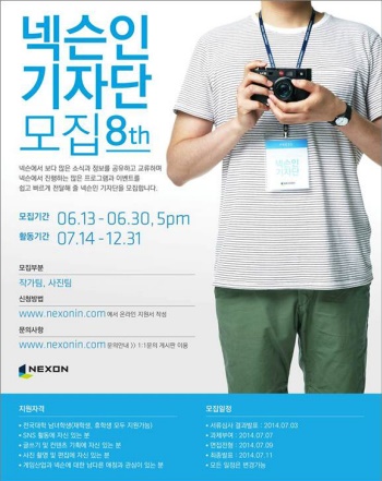 ... 선발된 학생들은 7월14일부터 12월31일까지 약 6개월 간 ‘넥슨인 기자단’으로 활동하게 된다. 이후 넥슨 컴퍼니 주최 사내행사 및 이벤트, 직원 교육 프로그램, 사회공헌활동 등에 참여해 취재하고, 넥슨인 홈페이지 및 넥슨인 블로그를 통해 관련 소식을 대외에 알리는 역할을