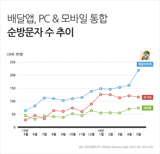 ... 배달 앱 시장은 지속적인 성장세를 이어가고 있다. 특히 최근 관련 업계에서 TV와 옥외 광고 등 대대적인 마케팅활동을 전개하면서 인지도와 재방문율이 높아졌다. 이러한 성장세는 여름방학과 장마철 등 배달 특수 시기가 다가오면 더욱 가파질 전망이다