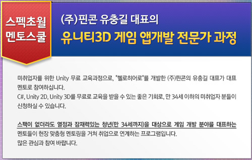 ...교육이 진행 되는 동안 월 20~30만원 정도의 역량개발지원금이 지원될 것이며 교육 이수 후에는 다양한 형태의 취업지원을 해줄 예정이다. 특히 이번 교육은 유충길 멘토가 면접을 통해 50명 멘티를 직접 선발, 이들에게 유니티 3D게임분야 비전 등을 제시할 계획이다. 한편 스