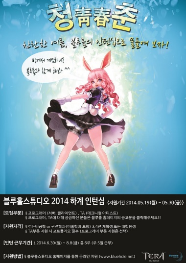 ... 인턴사원은 서류심사, 역량 및 인성 인터뷰를 통해 선발될 예정이다. 또한 6월 30일부터 8월 8일까지 총 6주간 실무 중심의 인턴십 프로그램을 수료하게 되며, 평가에 따라 채용 시 우대된다. 블루홀 김강석 대표는 “전문가로서 역량을 키우기 위해서는 다양한 노하우를 쌓아온