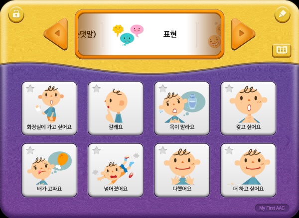 ... 감정, 활동, 음식, 색, 사회성 등 총 23개 카테고리에 300개 이상의 아이콘으로 구성됐으며 제작 과정에 언어, 아동, 교육 등의 전문가가 참여했고 학부모, 교사 등을 상대로 사용성 평가도 거쳤다. 보완대체 의사소통 프로그램은 미국과 유럽 등에서는 인지적 장애로 인해 자신