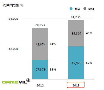 ... 2012년에는 국내 매출 61%, 해외 39%로 국내 비중이 높았다. 이용국 게임빌 부사장은 “주요 게임이 해외서 고른 성장세를 유지하고 있다”며 “몬스터워로드는 해외 매출 비중이 80%를 넘고 출시 18개월 연속 성장세를 이어가고 있으며 ‘피싱마스터’ 역시 대만, 일본