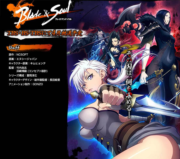 ... 블소 TV애니메이션은 일본 공중파 TBS에서 4월부터 방영될 예정이며 이 외에도 블소 원작의 매력적 캐릭터들을 활용한 상품도 개발 예정이다. 한편 블소는 제작기간 약 5년, 제작비 총 500억원 이상이 소요된 블록버스터급 MMORPG로 2012년 6월 국내에서 정