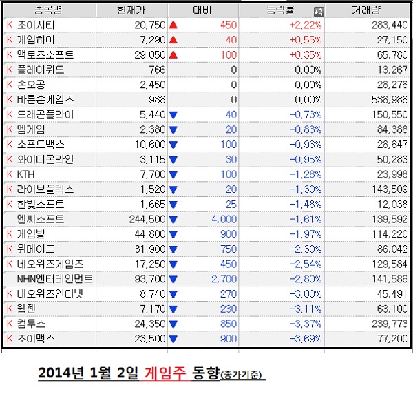 ... 엔씨소프트가 오전 한 때 25만3000원까지 올랐고, 게임빌과 컴투스 역시 각각 4만6850원과 2만5700원까지 치솟았다. 하지만 상승세는 오래가지 못했고 결국조이시티(+2. 22%)와 게임하이(+0