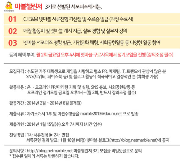 ...최종 합격한 ‘마블챌린저’ 3기는 6개월간 온ㆍ오프라인 프로모션, 넷마블 게임 리뷰, 행사 참여 및 취재 등 다채로운 활동을 수행하며 매월 소정의 활동비 등 다양한 혜택을 받는다. 특히 ‘마블챌린저’ 활동은 넷마블 실무자들의 강의 및 멘토링을 통해 게임업계에 대한 이해를 높일 수