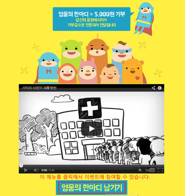 ...com/miraclehospital)을 통해 기적의 Like(좋아요) 캠페인에 동창해 응원 댓글 1개당 5천원의 기부금을 조성해 푸르메재단에 전달한다고 26일 밝혔다. 이번 캠페인은 시민들에게 어린이만을 위한 전문재활병원의 필요성을 보다 친근하게 알리고 작은 참여를 통해 병원 건립