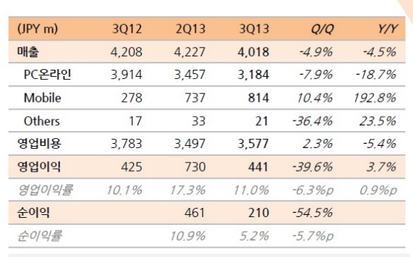 ...6% 떨어진 4억4100만엔의 영업이익을 기록했고 밝혔다. 부문별로는 PC온라인게임 매출이 31억엔으로 전분기 대비 -7. 9% 감소했으며, 모바일게임은 10