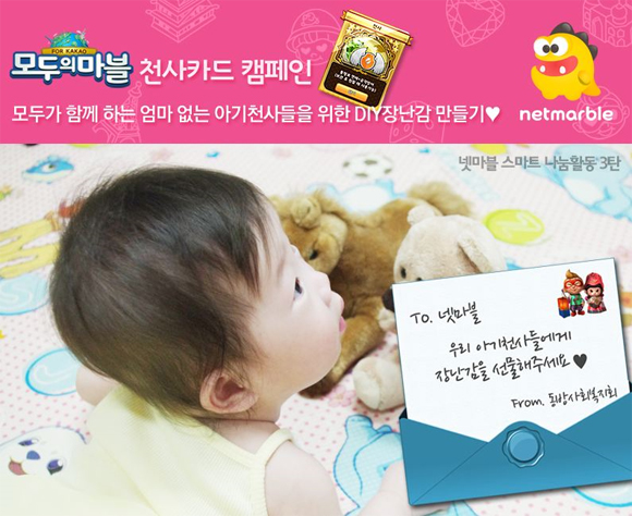 ... 이 캠페인은 사회복지기관 동방사회복지회와 유아용품 쇼핑몰 난쟁이똥자루가 함께 진행하며 DIY장난감 키트, 배송비 등 비용의 전액을 넷마블이 부담한다. 참여를 원하는 이용자는 넷마블 블로그 '모마 천사카드 캠페인' 게시판에 DIY키트를 수령할 연락처를 입력하는 방식으로 참가