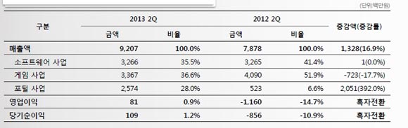 ... 이와 같은 성장세를 견인한 것은 지난해 말 출시된 모바일게임 '확산성 밀리언아서'다. 이 게임이 올 상반기 기록한 매출은 299억원으로 이는 전체 매출의 44. 1%를 차지하고있는 것