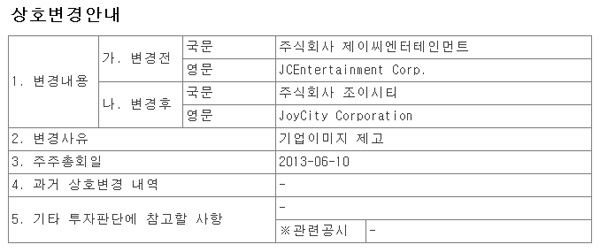 ... 조이시티 조성원 대표이사는 "사명 변경은 본격적인 해외 진출을 위한 통합 브랜드 구축 작업의 일환"이라며, "새로운 마음가짐으로 양질의 콘텐츠를 선보이기 위해 최선을 다하겠다"고 전했다. 변경된 사명은 10일부터 적용되며, 주식 상장명을 포함한 각종 정보 변경은 이달 말까