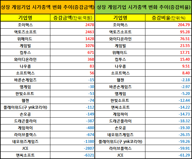... ◆ 20개 상장기업 전체 시총 ‘8조9424억->8조5565억’ 2013년 5월3일, 20개 상장게임사 기업가치는 총 8조5565억원으로 집계됐다. 이는 지난 2012년 7월 19일 8조9424억원보다 약 3859억(-4. 32%) 하락한 수치다