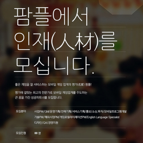 ... 서류 전형 합격자는 개별 통보될 예정이며, 서류 전형 합격자에 한해 역량 평가를 위한 1~2차 면접을 거쳐 5월 말에 최종 채용여부가 결정 된다. 팜플은 스마일게이트 관계사로 모바일 게임사업을 담당하고 있는 스마트 디바이스 게임 전문기업이다. 지난 3월 26일 첫