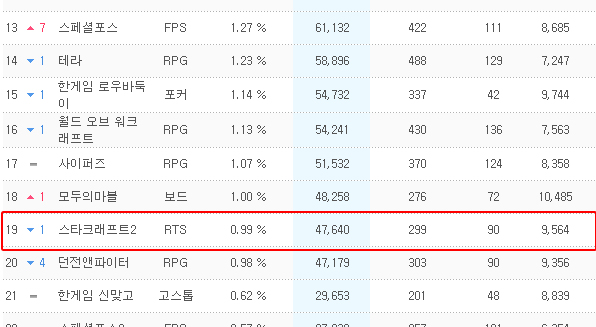 ... 이는 게임 출시 후 처음으로 있는 일로 지난 15일 20위로 떨어졌을 때에도 1. 01%를 기록했다. 이에 따라 확장팩으로 대대적인 변화를 가했으나 군단의심장에서도 전작인 스타크래프트의 아성을 넘기는 사실상 불가능해졌다