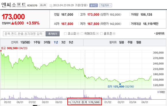 ... 3거래일 연속 상승세를 나타내며 지난 4월 3일 이래 약 4개월 만에 16만원선을 회복했다. 3일 동안의 상승폭은14. 22%로 이는지난해 6월 최고 기대작이었던 블레이드앤소울의 국내 론칭과 길드워2 북미 유럽 발매를 전후한 연속 상승 당시보다 높은 수치다