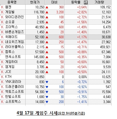 ...56% 오른 1만250원, 11만6300원에 거래를 시작했다. 이외에도네오위즈게임즈, 컴투스, 조이맥스, 위메이드 등이 1% 내외의 상승세를 나타내고 있다. [김상두 기자 notyet@chosun