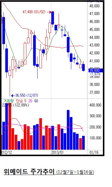 ... 지난 해 12월 7일 3만9850원을 기록한 이래 24일거래일만에 또 다시 4만원선이 붕괴된 것. 이날은 특히 자회사인 조이맥스와 위메이드크리에이티브의 새로운 수장인 김창근대표와 조계현 대표가 자사주 매입을 발표했음에도 약세를 보여 눈길을 끌었다. 위메이드는 올해 들어