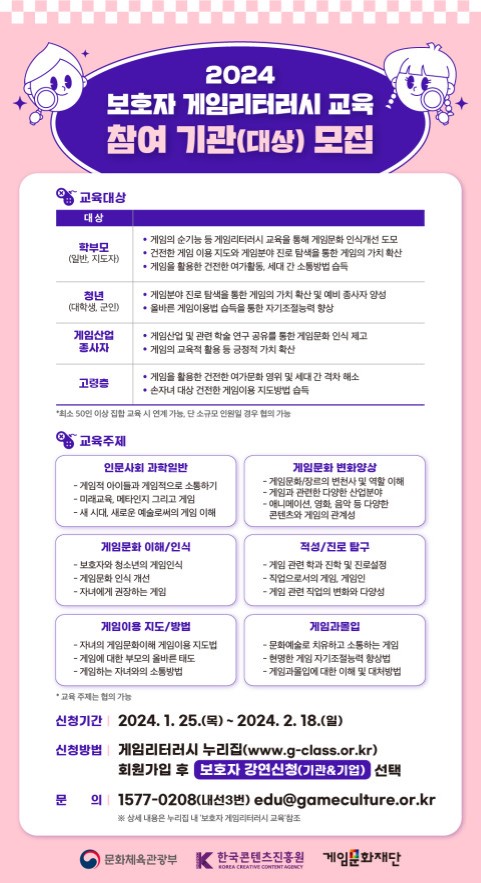 ... △게임 이용 지도 및 방법(자녀의 게임 이용 지도 및 부모의 올바른 태도) △인문사회, 과학일반(미래교육, 메타인지, 그리고 게임, 새로운 예술로서의 게임 이해하기) △게임문화 변화 양상(애니메이션, 영화, 음악 등 다양한 콘텐츠와 게임의 관계성) 등 게임에 대한 다양한 주제를