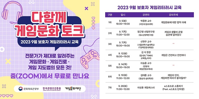 ... 첫 강연은 9월 5일(화)이며 ▲국민대 법과대학 박종현 교수가 ‘게임문화에 대한 법적 이해’를 주제로 게임과 관련한 부정적 편견을 해소하고 게임문화 예술의 진흥을 제고할 수 있도록 국내외 현황과 사례를 활용하여 알기 쉽게 풀어나간다. 9월 7일