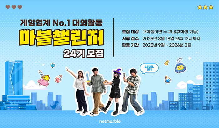 ... 지원 희망자는 이날 오후 2시부터 넷마블 공식 채용 홈페이지 내 ‘마블챌린저’ 모집 공고에 서류를 접수하면 된다. 서류 접수 기간은 8월 18일까지이며, 면접까지 통과한 최종 합격자는 2025년 9월부터 약 6개월 동안 ‘마블챌린저&rsqu