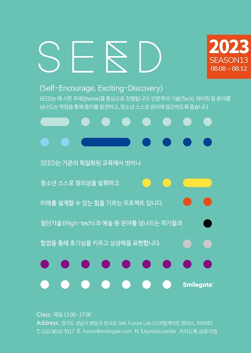 ... 이번 SEED 시즌 13 ‘로봇이 아닙니다’에서는 인공지능(AI) 기술을 다양한 방식으로 활용해 새로운 ‘나‘를 탐구할 수 있는 과정이 진행될 예정이다. 8월 8일부터 12일까지 5일간 AI 캐릭터 구축, 트랜스미디어 스토리텔링